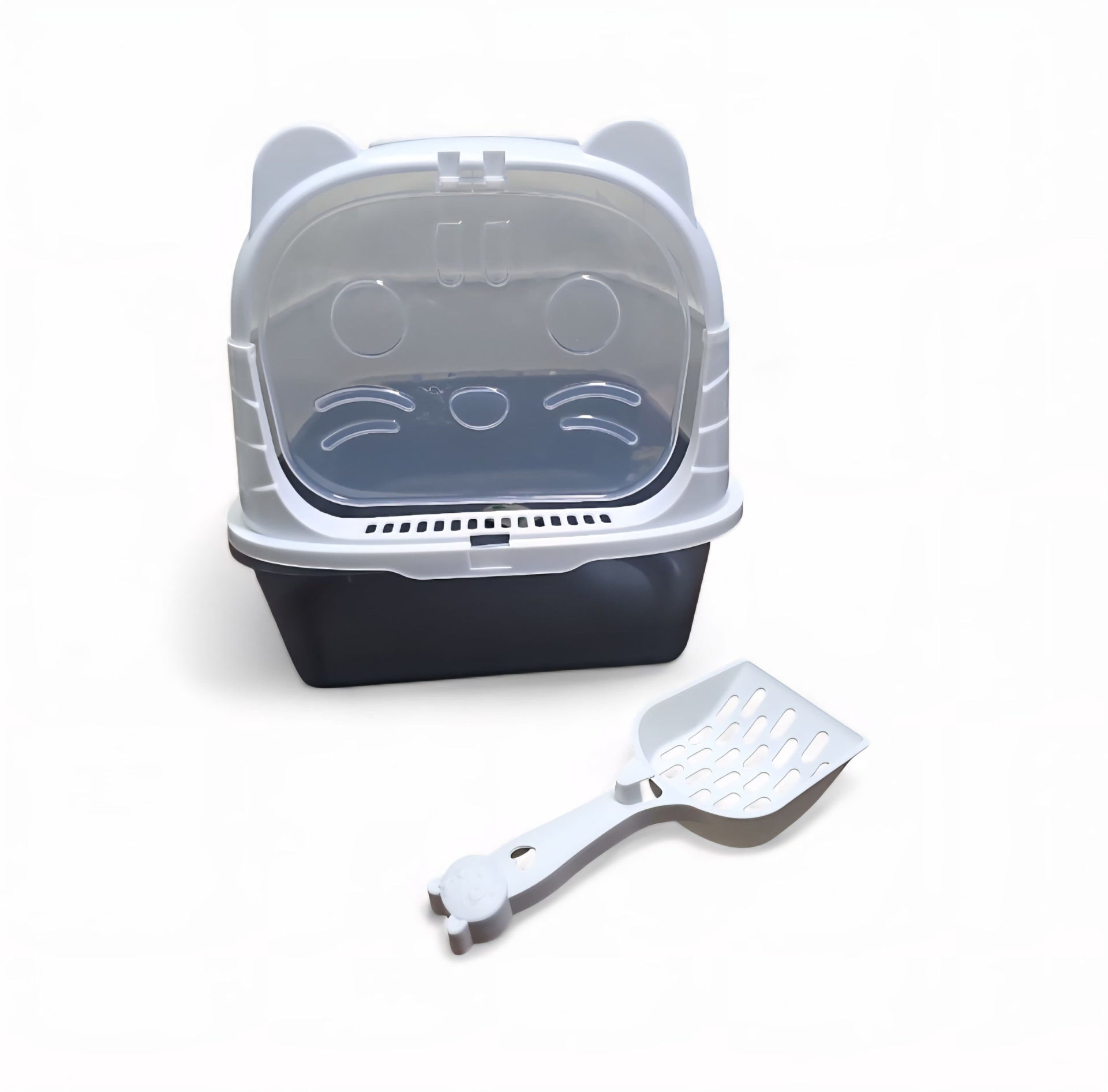 Baño sanitario para gatos con diseño tipo orejas, práctico y funcional. Sus dimensiones de 47 cm de largo, 35 cm de ancho y 34 cm de alto brindan un espacio cómodo para el uso diario. Fabricado en material resistente y fácil de limpiar. Incluye pala para una limpieza rápida y eficiente.