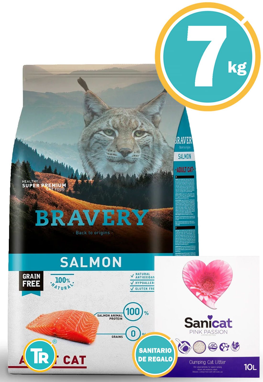 TU RACIÓN PROMOCIÓN DISPONIBLE BRAVERY Gato Adulto Salmón 7kg + Sanicat Pink