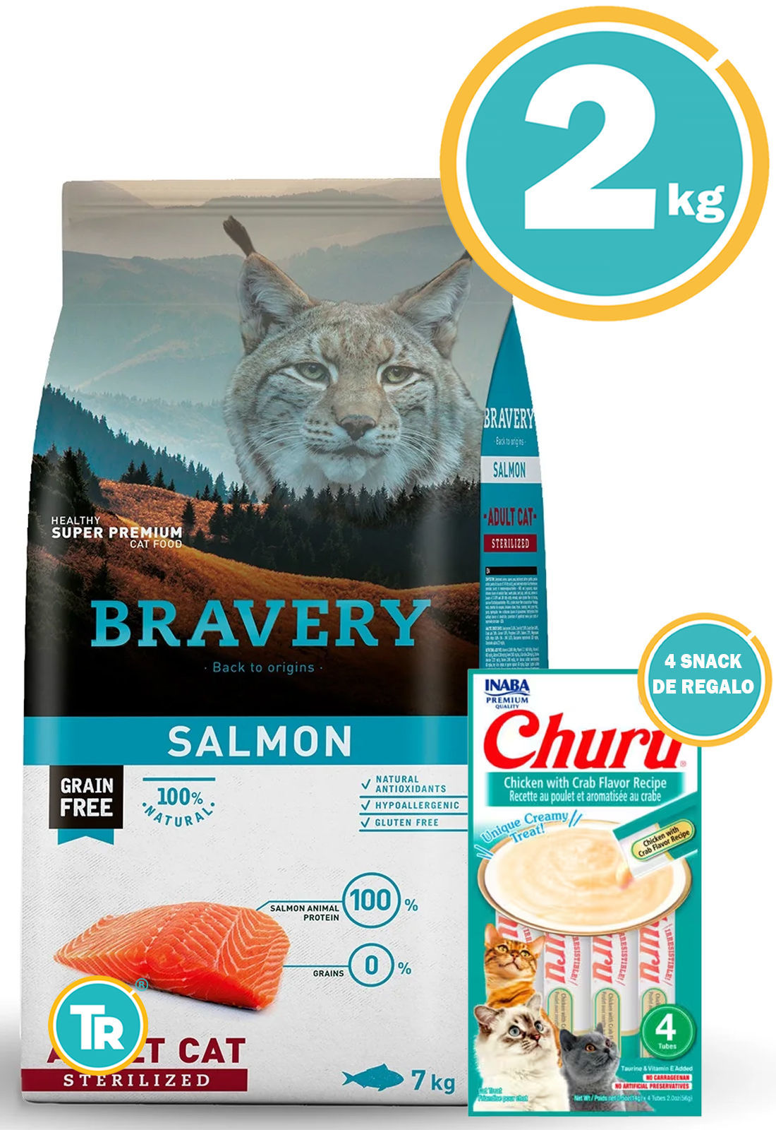 BRAVERY GATO ADULTO CASTRADO SALMON 2 KG + Snack Churu (atún)
