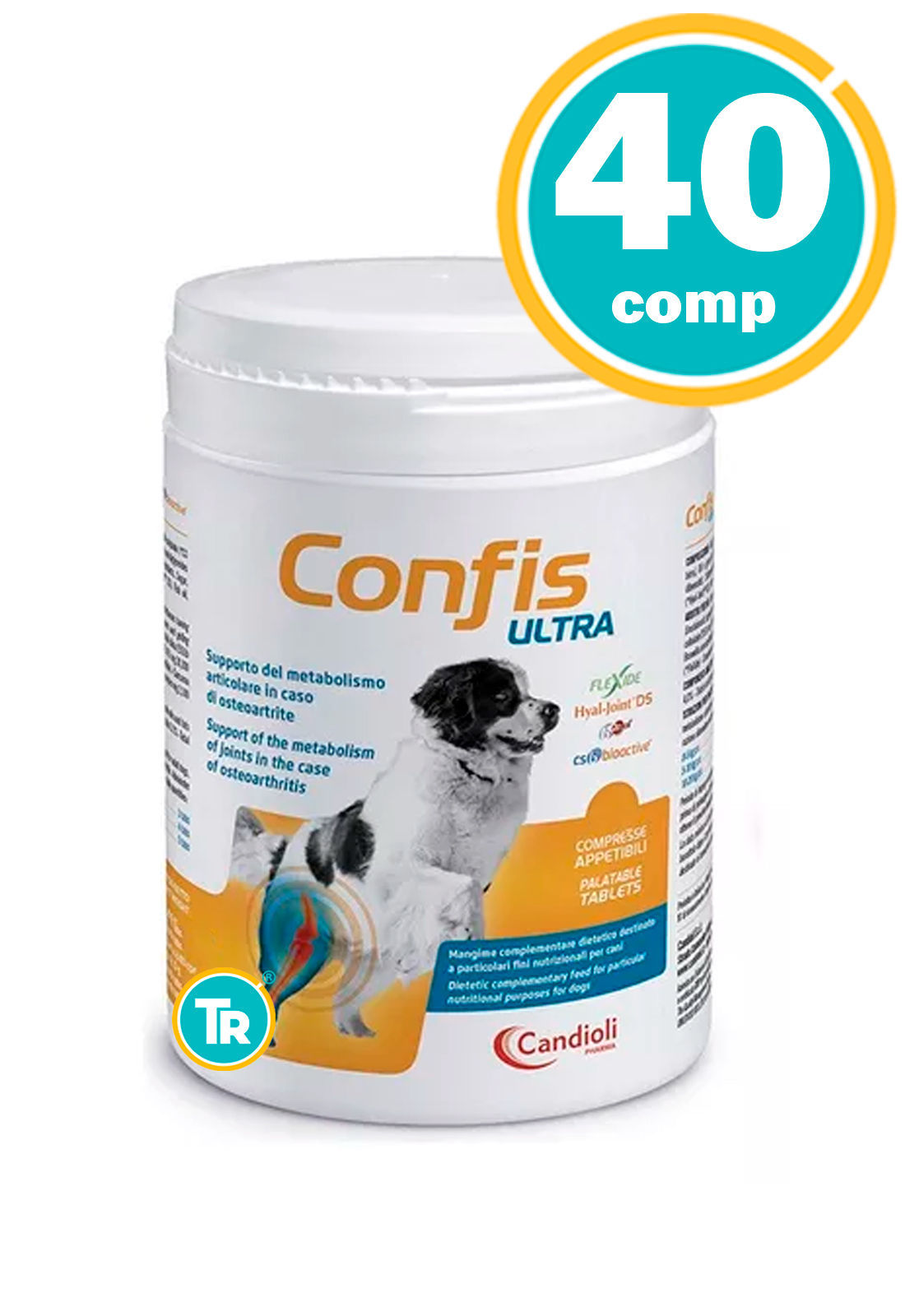Glucosamina (quitosamina) de tejidos animales, aceites y grasas vegetales (aceite de linaza), sulfato de condroitina (CS BIOACTIVE*), fosfato dicálcico, subproductos del cerdo, azúcar, levadura (levadura de cerveza), subproductos vegetales, estearato de magnesio, aceite de pescado , ácido hialurónico (Hyal-Joint DS **), colágeno extraído del esternón de pollo (b-2Cool °), celulosa microcristalina E460, goma guar E412, coloide de silicona E551b, vitamina E, extracto de té (Camellia sinensis LO Kuntze), extracto de olíbano , Flexida °°.