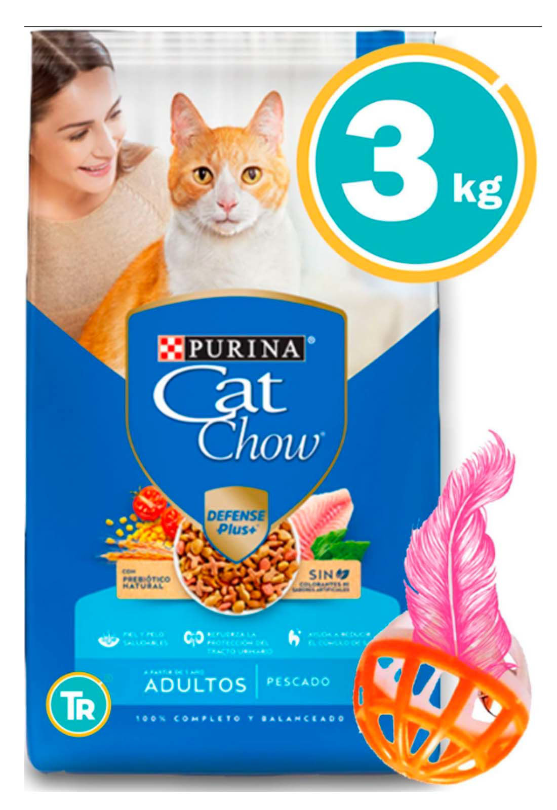 TU RACIÓN PROMOCIÓN DISPONIBLE Cat Chow Adultos Pescado 3kg + Pelota Cascabel y Pluma (sku PC12)
