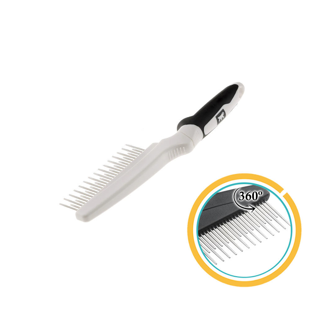 Peine diseñado para el cuidado del manto de perros y gatos de pelo intermedio y largo. Es equipado de una única fila de dientes en metal cromado muy acercados y colocados de manera que aquellos largos y aquellos cortos se alternen, garantizando así una acción profunda y eficaz. Además, los dientes tienen la particular característica de girar: de este modo, acompañan el movimiento del peine, ayudando a eliminar sencillamente los nudos y el pelo suelto y muerto, alisan el manto sin arrancarlo y lo limpian de posibles impurezas. Dimensiones: 21 x 5,7 x h 2,4 cm.