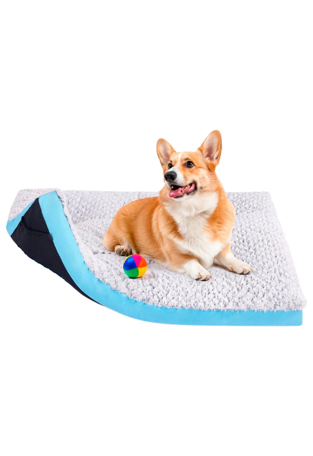 Colchoneta para mascotas ideal para brindar descanso y comodidad. Diseño en color gris con detalles en azul celeste. Su estructura acolchada ofrece una superficie suave y confortable, pensada para el uso diario en interiores.