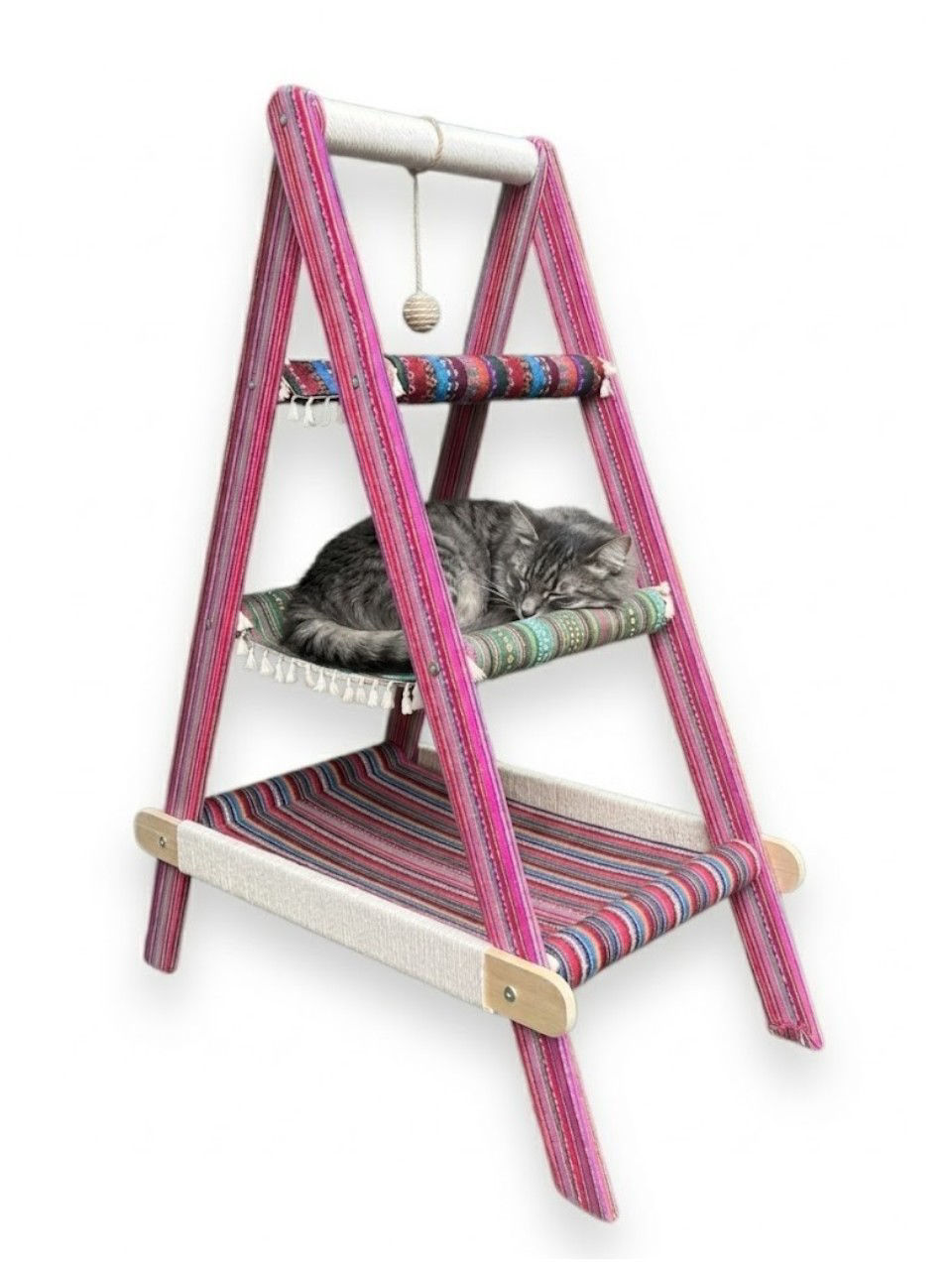 Convierte el descanso de tu gato en una experiencia única con esta estructura de hamacas en niveles, diseñada para combinar comodidad, diversión y estilo artesanal. Su armazón en forma de A está recubierto con telas vibrantes de inspiración tradicional, mientras que cada nivel ofrece una hamaca tejida con patrones coloridos que invitan al relax.