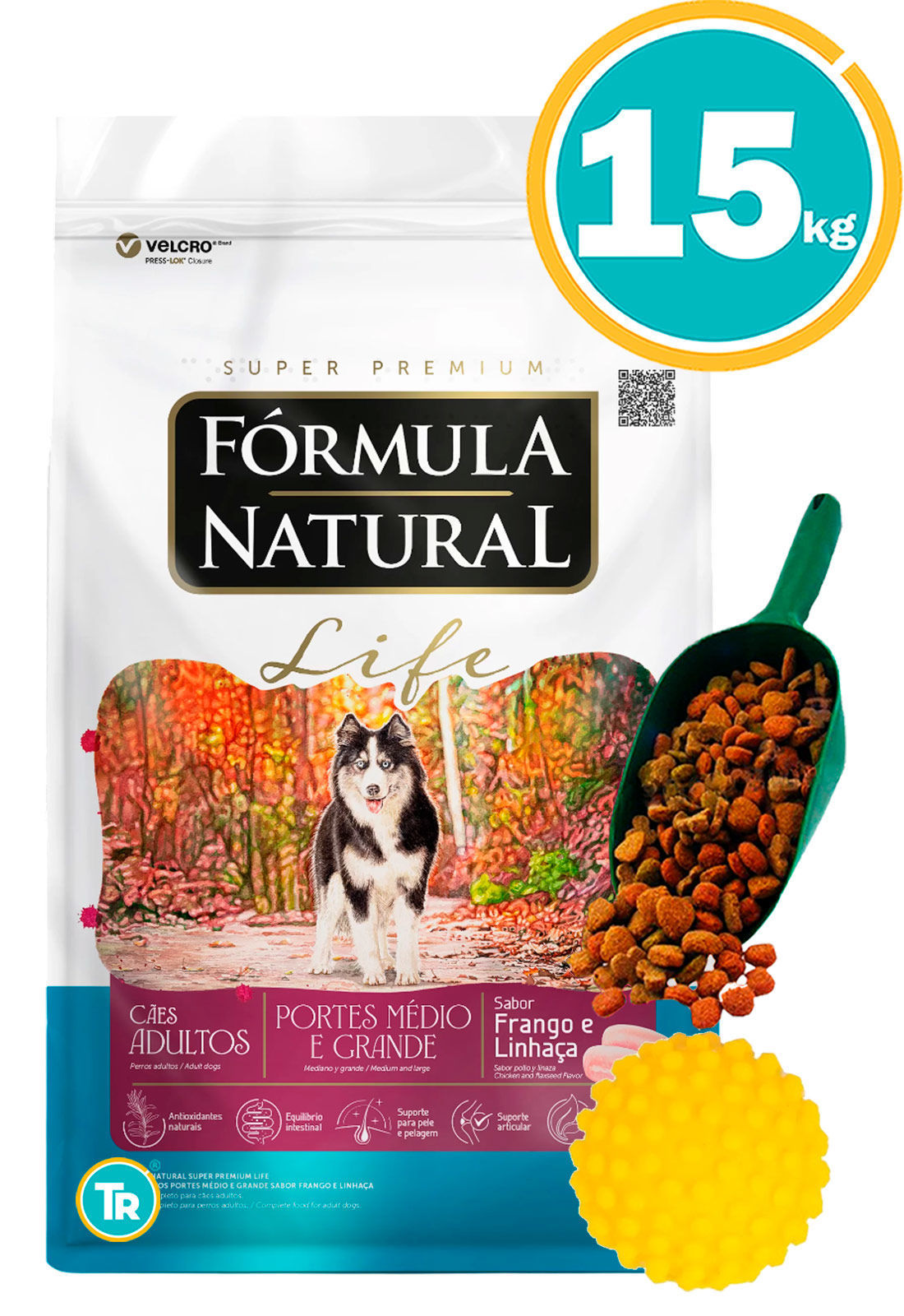 Harina de vísceras de pollo, arroz quebrado, salvado de trigo, linaza, aceite de pollo, aceite de salmón, hidrolizado animal, frutas y vegetales deshidratadas, pulpa deshidratada de remolacha, cloruro de sodio, harina de algas, pared celular de levadura, fructooligosácaridos, inulina, extracto de yuca, sulfato de condroitina, sulfato de glucosamina, vitaminas, minerales, cloruro de potasio, hexametafosfato de sodio, ácido propiónico, extractos vegetales, concentrado de tocoferoles (antioxidante natural).