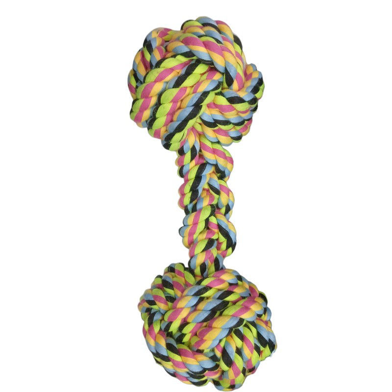 Un juguete interactivo y resistente, ideal para juegos de tirar, traer y morder. Su diseño tipo mancuerda, con dos extremos de nudos firmes unidos por una sección trenzada, ofrece diversión y ejercicio mientras ayuda a mantener la salud dental de tu mascota.