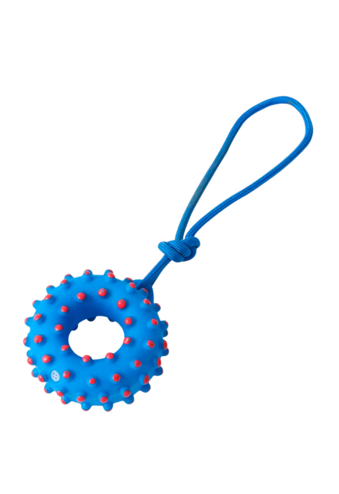 Juguete de goma en forma de dona con cuerda resistente, ideal para juegos interactivos como tirar y traer.