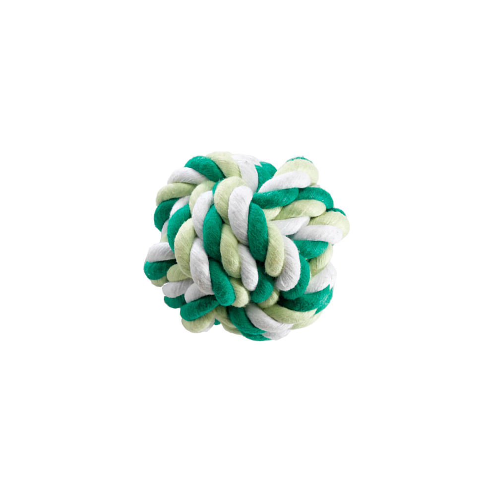 Un original juguete para perro hecho de algodón con la forma de una pelota y con cuerdas multicolor trenzadas. Disponible en dos tamaños, esta pelota de juguete es una buena opción para cambiar los juguetes clásicos de látex o goma. Los colores de las cuerdas son blanco, verde oscuro y verde claro, y resulta muy bonito. Diviértete e intenta lanzar la bola lo más lejos que puedas para que tu perro la vaya a buscar justo después; será divertido!