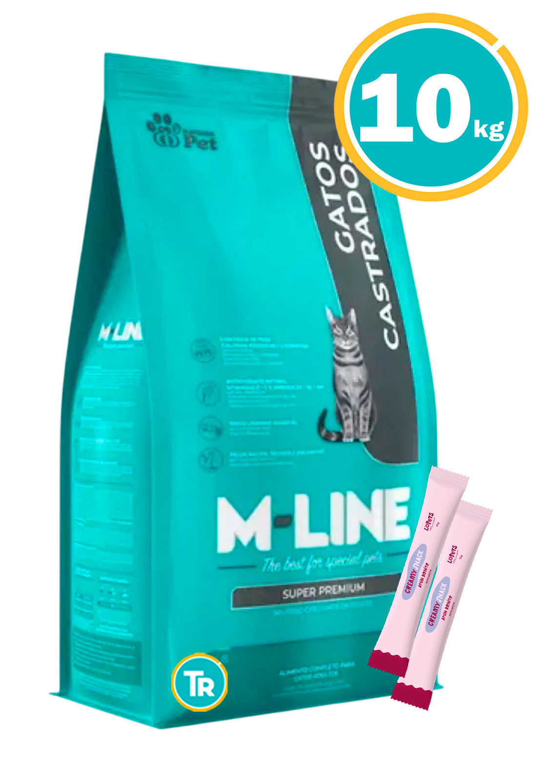 El alimento M-Line Cat Castrado se recomienda para gatos adultos, especialmente castrados, de todas las razas, sexos y tamaños. Está disponible en envases de 1 kg y 10,1 kg.
