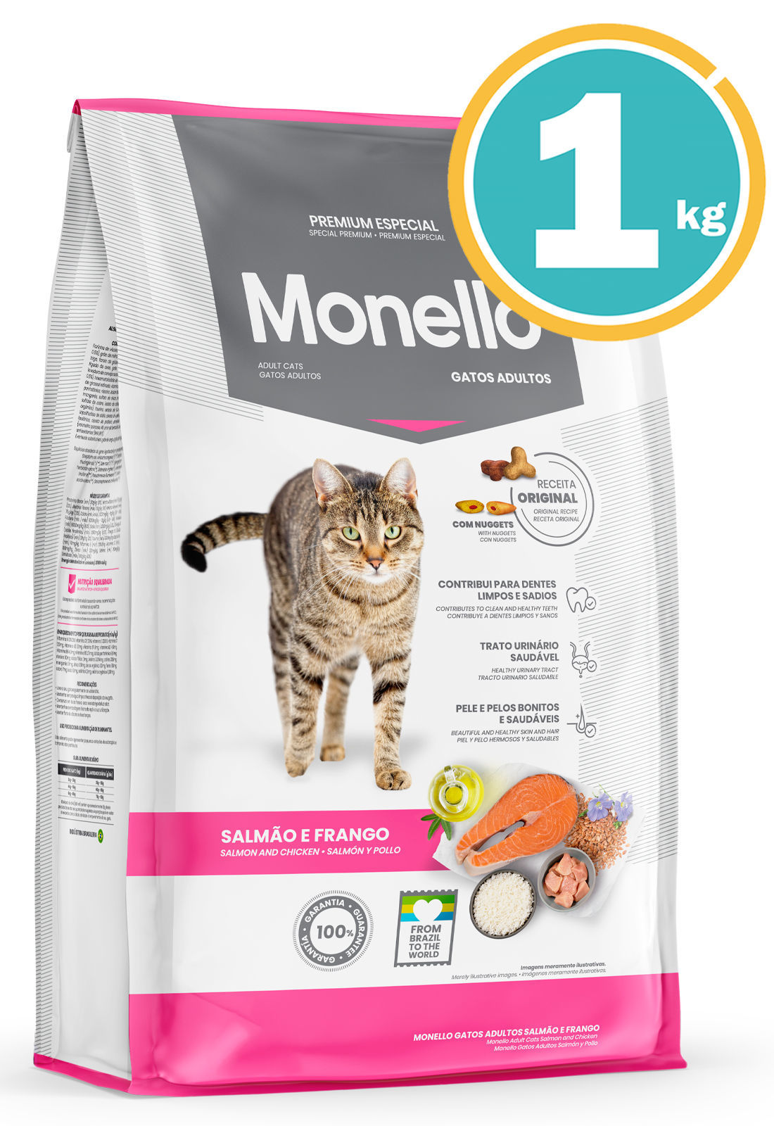 Monello Cat Salmón, Atún & Pollo es un producto premium especial desarrollado para gatos adultos con paladar exigente, que proporciona máxima nutrición. Posee la adición de Taurina, que promueve la mejor salud de la visión y del corazón del felino, además de contener ingredientes seleccionados que auxilian en la prevención de cálculos urinarios, promoviendo una alta digestibilidad. Monello Cat Salmón, Atún & Pollo posee nuggets rellenos para una comida con mucho sabor.