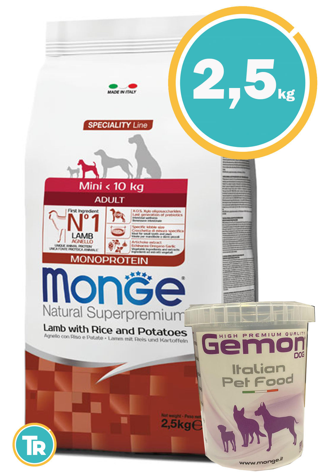 Monge Natural Superpremium Mini Adult Monoprotein* Cordero con arroz y patatas es un alimento completo para perros adultos de raza mini. Específicamente desarrollado pensando en el bienestar de su perro, gracias a la presencia de nutrientes de calidad resultantes de la investigación Made in Italy. Producto formulado con una única fuente de proteína animal*, el cordero como primer ingrediente y con la inclusión de carne fresca para una óptima digestibilidad y palatabilidad. La receta está enriquecida con la última generación de prebióticos xilo-oligosacáridos (XOS) para apoyar el bienestar intestinal. La formulación también contiene ingredientes y extractos vegetales, como la raíz de equinácea, el orégano, el extracto de ajo y alcachofa, y la espirulina, que contiene antioxidantes para neutralizar los radicales libres. El tamaño de la croqueta se ha desarrollado específicamente para dientes y mandíbulas pequeñas. Sin colorantes ni conservantes artificiales añadidos.