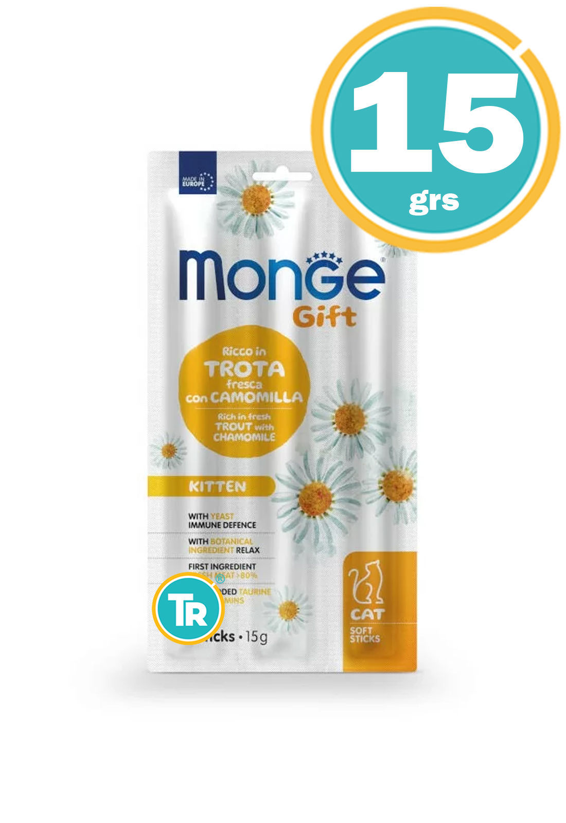 Monge Gift Soft Sticks Skin support Cat Adult Bacalao con trébol rojo es un alimento complementario y sin cereales para gatos adultos que necesitan un apoyo para la piel. Especialmente formulado para el bienestar de tu gato gracias a la levadura de cerveza para un pelaje brillante y un bajo contenido de grasa para ayudar a mantener un peso corporal ideal. Fórmula rica en carne fresca de trucha, que es una valiosa fuente de proteínas altamente digestibles y biológicamente valiosas.