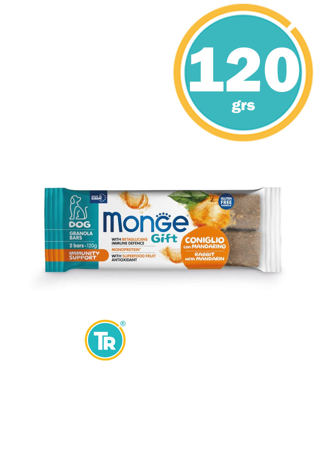 Monge Gift Granola Bars Immunity Support Dog Adult Rabbit with Tangerine es un alimento complementario sin cereales para perros adultos. Especialmente formulado para el bienestar de tu perro con L-carnitina para mantener la masa corporal magra. La fórmula se basa en proteínas animales sin gluten y de una sola fuente: el conejo, que es una valiosa fuente de proteínas altamente digestibles y biológicamente valiosas.