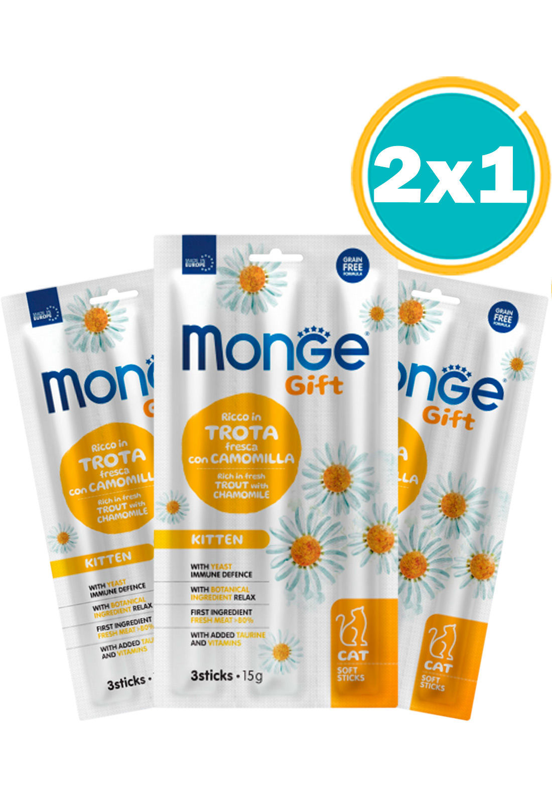 Monge Gift Soft Sticks Kitten Trucha con Manzanilla es un alimento complementario y sin cereales para gatitos en crecimiento. Especialmente formulado para el bienestar de tu gatito con la inclusión de productos de levadura para apoyar el sistema inmunológico y gracias al bajo contenido de grasa para mantener el peso corporal ideal durante el crecimiento. Fórmula rica en carne fresca de trucha, que es una valiosa fuente de proteínas altamente digestibles y biológicamente valiosas.