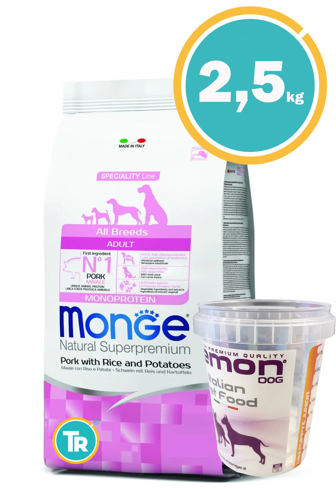 Carne de cerdo (deshidratada 30%, carne fresca 10%), arroz (15%), proteína de patata (5%), maíz, pulpa de remolacha desecada, levadura de cerveza, proteínas animales hidrolizadas (hígado), grasa animal (manteca de cerdo depurada 99,5%) , sustancias minerales, avena, productos de levadura (manano oligosacáridos MOS 1%), xilooligosacárido (XOS 0,3%), yucca schidigera (0,3%), harina de algas (espirulina – Arthrospira platensis 0,3%), productos obtenidos de la transformación de vegetales (raíz de Echinacea purpurea 0,2%, Origanum Vulgare 0,1%), ajo seco (0,2%), glucosamina, sulfato de condroitina.