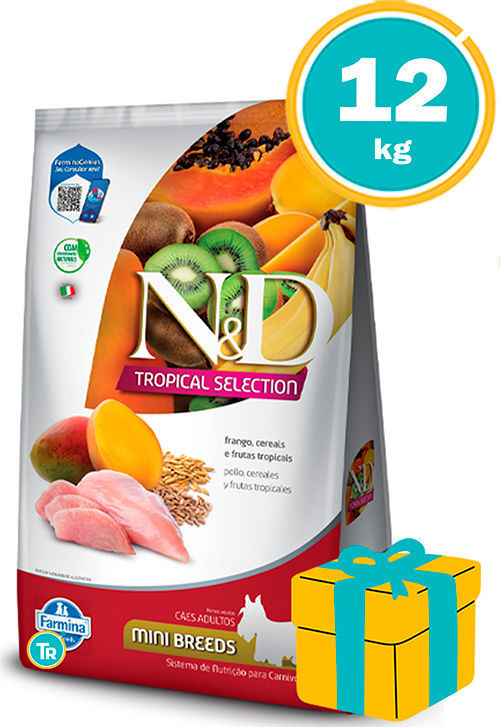 Pollo (carne mecánicamente separada de pollo, harina de vísceras de pollo – mín. 20%), cereales y frutas (avena, granos de sorgo, cebada em granos, plátano deshidratado, papaya deshidratada, kiwi deshidratado, mango deshidratado – mín. 35%), harina de chicharrón (piel de cerdo), harina de pescado, huevo en polvo, aceite de pollo, aceite de pescado, sub-producto de arroz, sub-producto de trigo, pulpa de remolacha, levadura seca de cervecería (Saccharomyces cerevisiae), zanahoria deshidratada, aditivos prebióticos (FOS y MOS), DL-metionina, taurina, L-carnitina, sulfato de condroitina, sulfato de glucosamina, aditivos adsorbentes (extracto de yuca (Manihot esculenta) y zeolita), hidrolizado de hígado de aves y cerdos, vitaminas (A, D3, E, B1, B2, B5, B6, B12, C, biotina, niacina, ácido fólico, cloruro de colina), cloruro de sodio, cloruro de potasio, hierro aminoácido quelato, cobre aminoácido quelato, zinc aminoácido quelato, manganeso aminoácido quelato, proteinato de selenio, yodato de calcio, propionato de calcio, concentrado de tocoferoles.