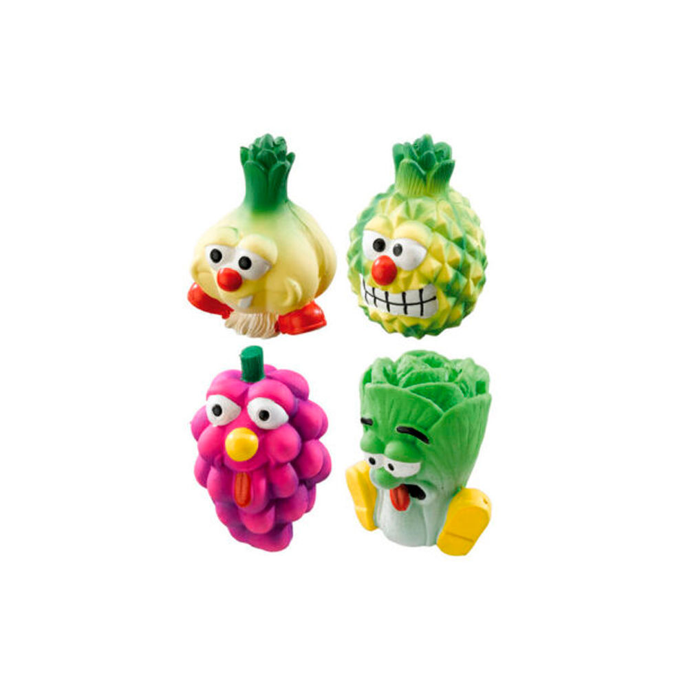 Este juguete para perros hecho de látex presenta frutas y verduras comunes como cebollas, uvas o piñas, tiene caras divertidas con ojos prometedores y un alegre efecto de sonido que sin duda despertará el interés de tu amigo. Dimensiones: h 10 cm // Precio por unidad // modelo sujeto a stock