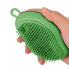 Cepillo ergonómico de silicona diseñado para el cuidado y limpieza del pelaje de mascotas. Su superficie con cerdas flexibles permite desenredar, masajear y remover pelo suelto de forma suave y efectiva.
