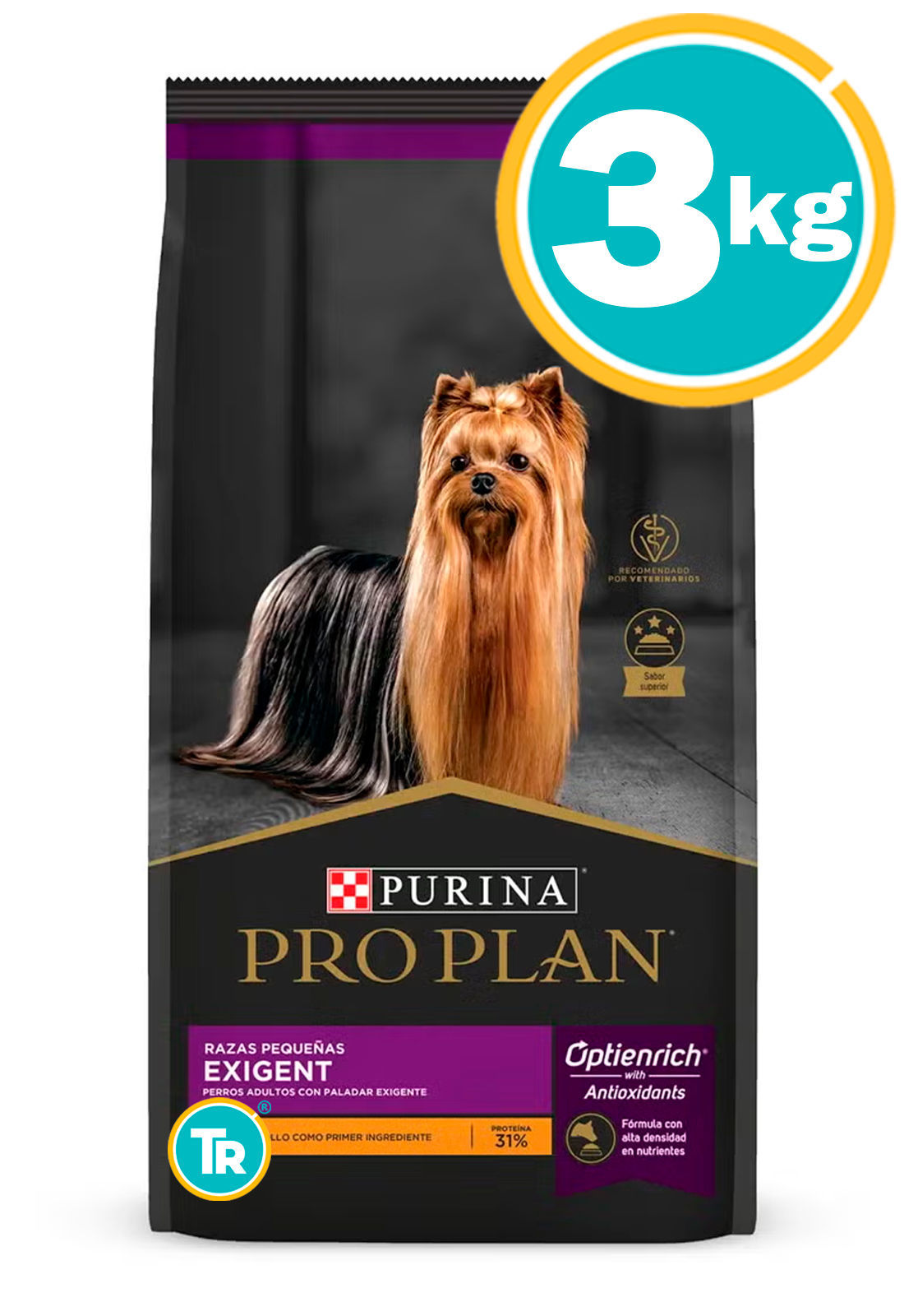 Carne de pollo, maíz, harina proteica de pollo, gluten de maíz, trigo, grasa animal (res y/o cerdo) preservados con tocoferoles (fuente de vitamina E y ácidos grasos omega 6), hidrolizado de pollo y/o cerdo, arroz, cloruro de sodio**, ortofosfato y/o carbonato de calcio, pulpa de remolacha, cloruro de potasio, vitaminas [A, C, D3, E, K3, mononitrato de tiamina (B1), riboflavina (B2), niacina (B3), pantotenato de calcio (B5), hidrocloruro de piridoxina (B6), biotina (B7), ácido fólico (B9), cianocobalamina (B12)], BHT, aceite de pescado y/o harina de alga (Schizochytrium sp.), zeolita, aminoácidos (lisina, taurina, cisteina, metionina y triptofano), minerales [(sulfatos: zinc, hierro, manganeso, cobre), minerales de alta absorción (proteinatos/glicinatos: zinc, hierro, manganeso, cobre, selenio)], sorbato de potasio, pirofosfato tetrasódico (TSPP), cloruro de colina, sulfato de magnesio, huevo y levadura seca de cervecería inactiva (Saccharomyces cerevisiae ssp.) (fuente de beta glucanos). **Cloruro de sodio (sal) (mín./máx.) 0,6% / 1,5%