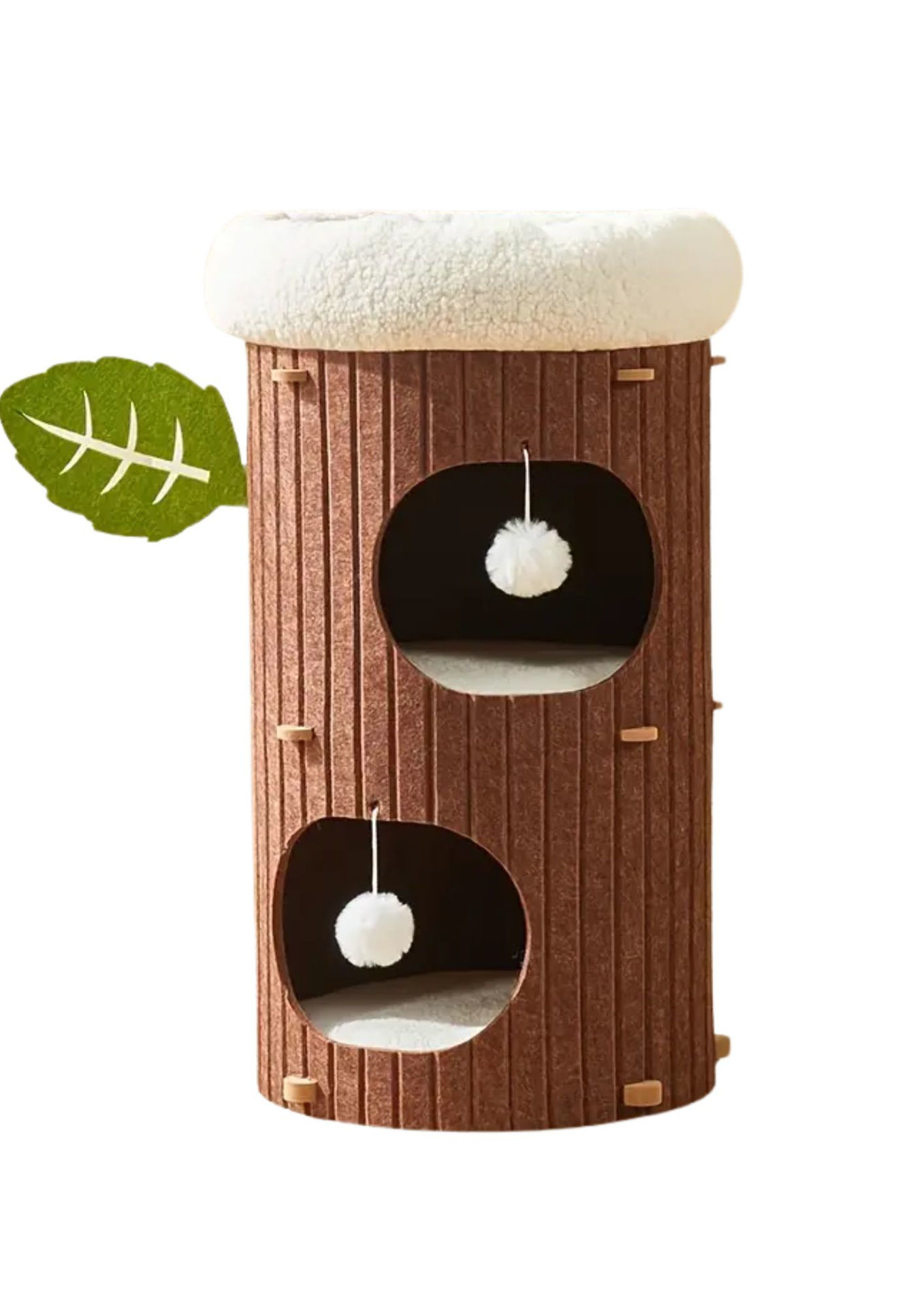 Rascador de dos niveles en tono marrón con estructura tipo cubeta, incluye almohadón interior. Diseño cómodo y funcional para descanso y juego.