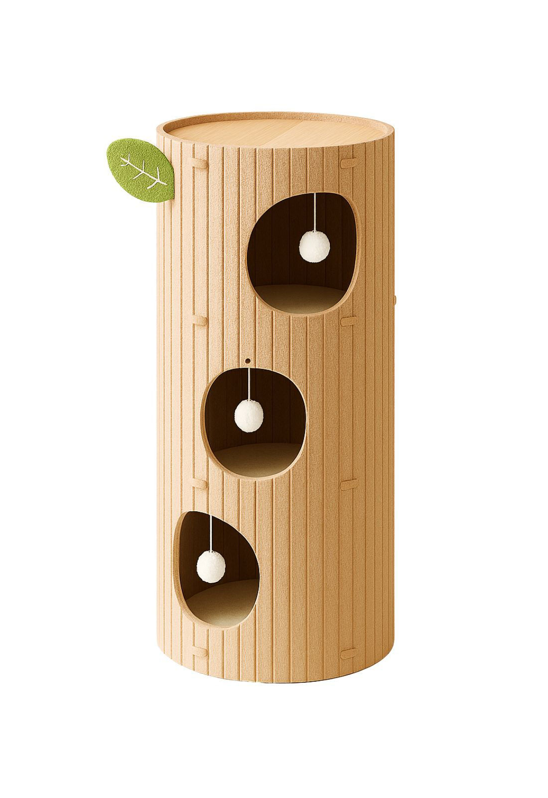 Diseño cilíndrico en tono camel con tres niveles de descanso y juego. Incluye pelotas colgantes para mayor entretenimiento. Estilo cálido, ideal para integrarse a cualquier ambiente.
