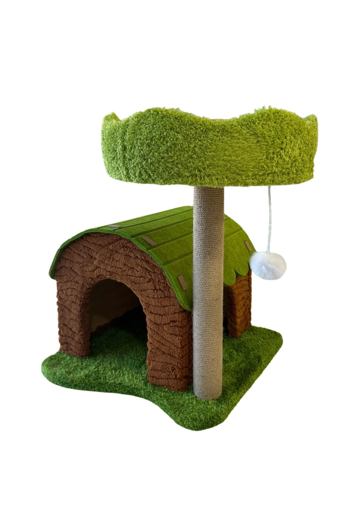Un rincón perfecto para que tu gato descanse, juegue y explore. Este rascador con forma de casa combina diseño adorable con funcionalidad. Inspirado en una cabaña del bosque, incluye un acogedor refugio en la base, techo verde texturizado, un poste revestido en sisal para afilar las uñas y una plataforma elevada tipo nido con borde para mayor comodidad.