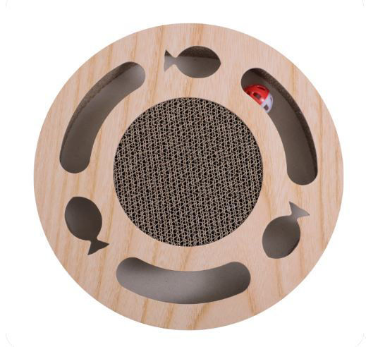 DIMENSIONES DEL PRODUCTO: Diametro 32,5 cm x Altura 5,5 cm Todo el juego de rascado, incluida la superficie de rascado, está hecho de cartón corrugado y cartón estable.