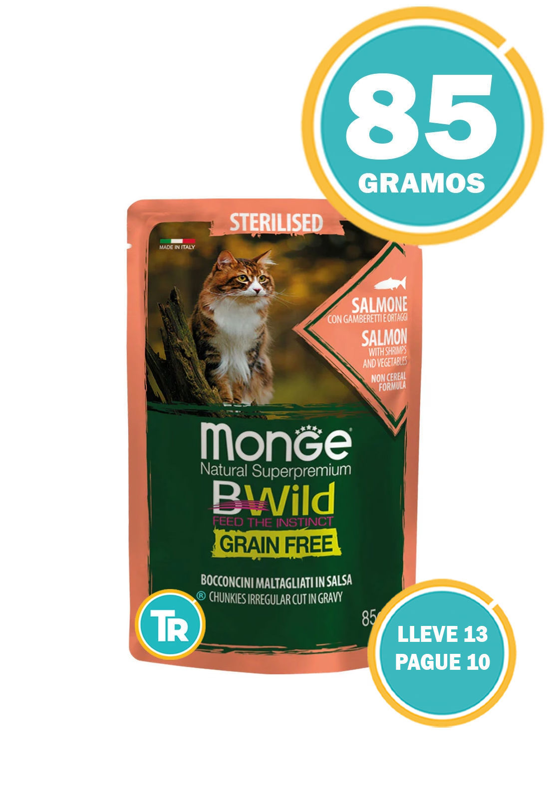 Monge Natural Super Premium Bwild Grain Free Formula Sterilized Cat Salmon con gambas y verduras (judías verdes y zanahorias) es un alimento completo y equilibrado para gatos adultos esterilizados.