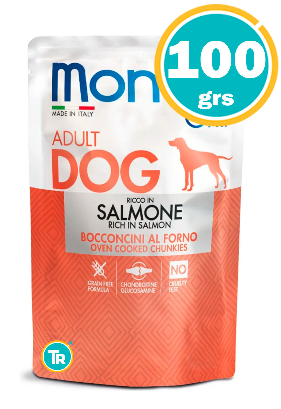 Alimento completo para ADULTOS con CARNE DE SALMÓN cocida al horno. SIN CEREALES. Con Glucosamina y Condrotina para apoyo a las articulaciones. || COMPOSICIÓN: Carne y derivados (Pollo 11%, pavo 7%) pescado y subproductos del pescado 25% (salmón 14%, atún 11%), sales minerales, glucosamina 0,008%, sulfato de condroitina 0,004%.