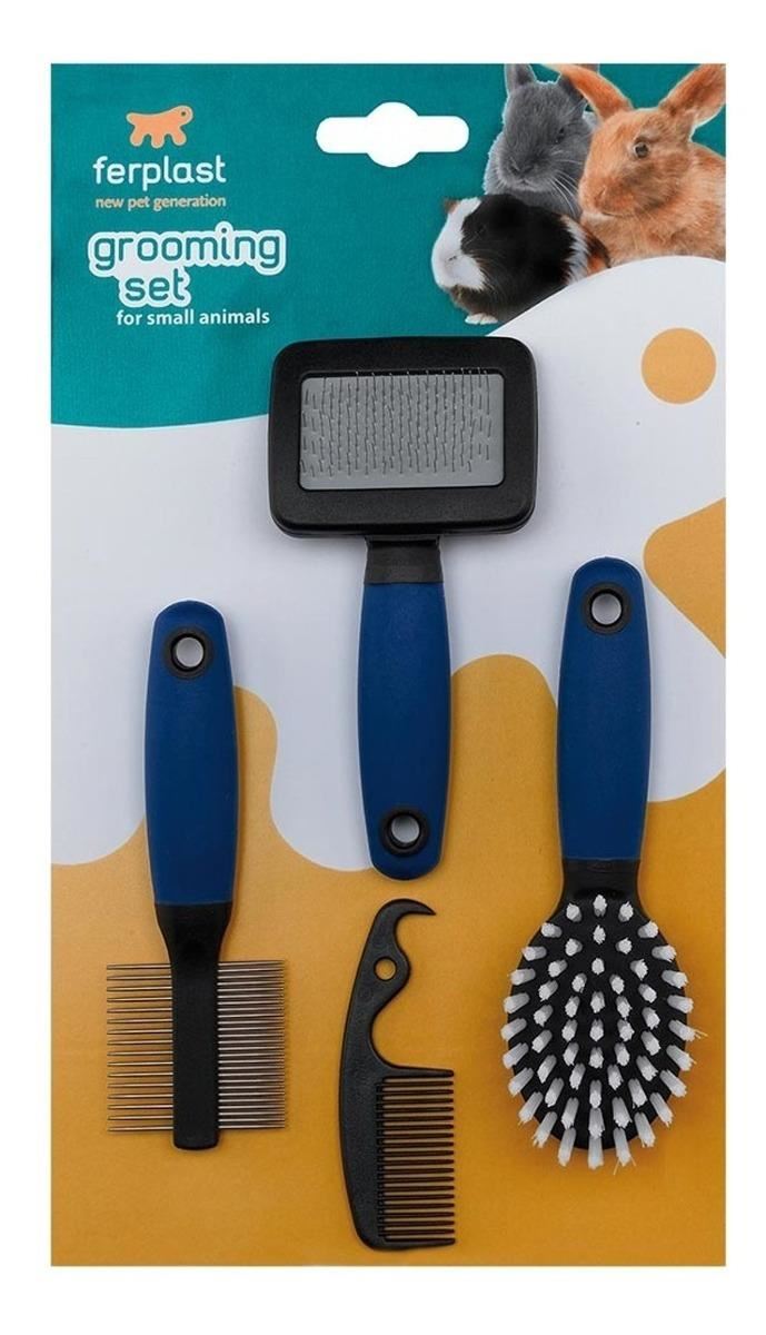 Aquí puede encontrar todas las herramientas necesarias para el cuidado de su animal pequeño. GRO 5998 es un conjunto completo: en su interior encontrará un cepillo para conejo, un peine doble y una carda para quitar el pelo muerto. Disponible en una versión con mango de color.