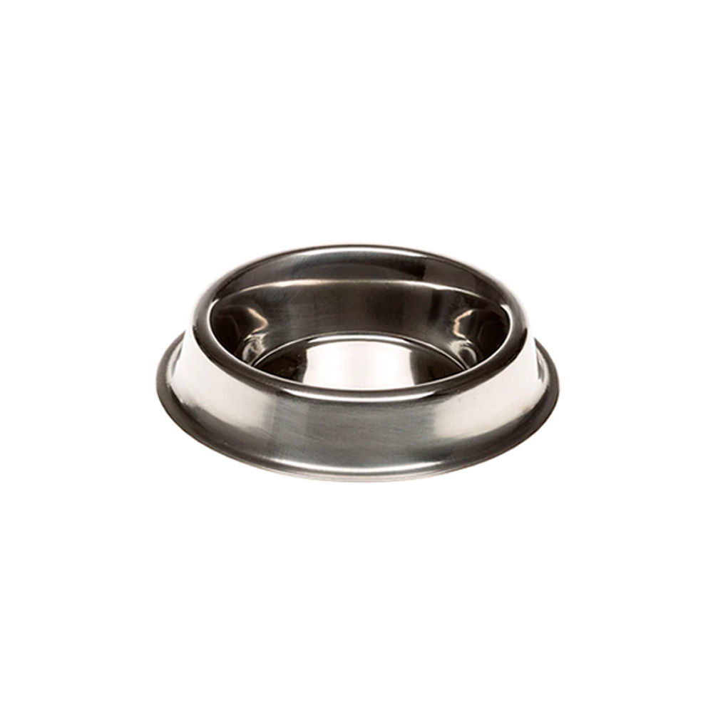 Bol de acero inoxidable con goma anti deslizante, disponible en diferentes tamaños.