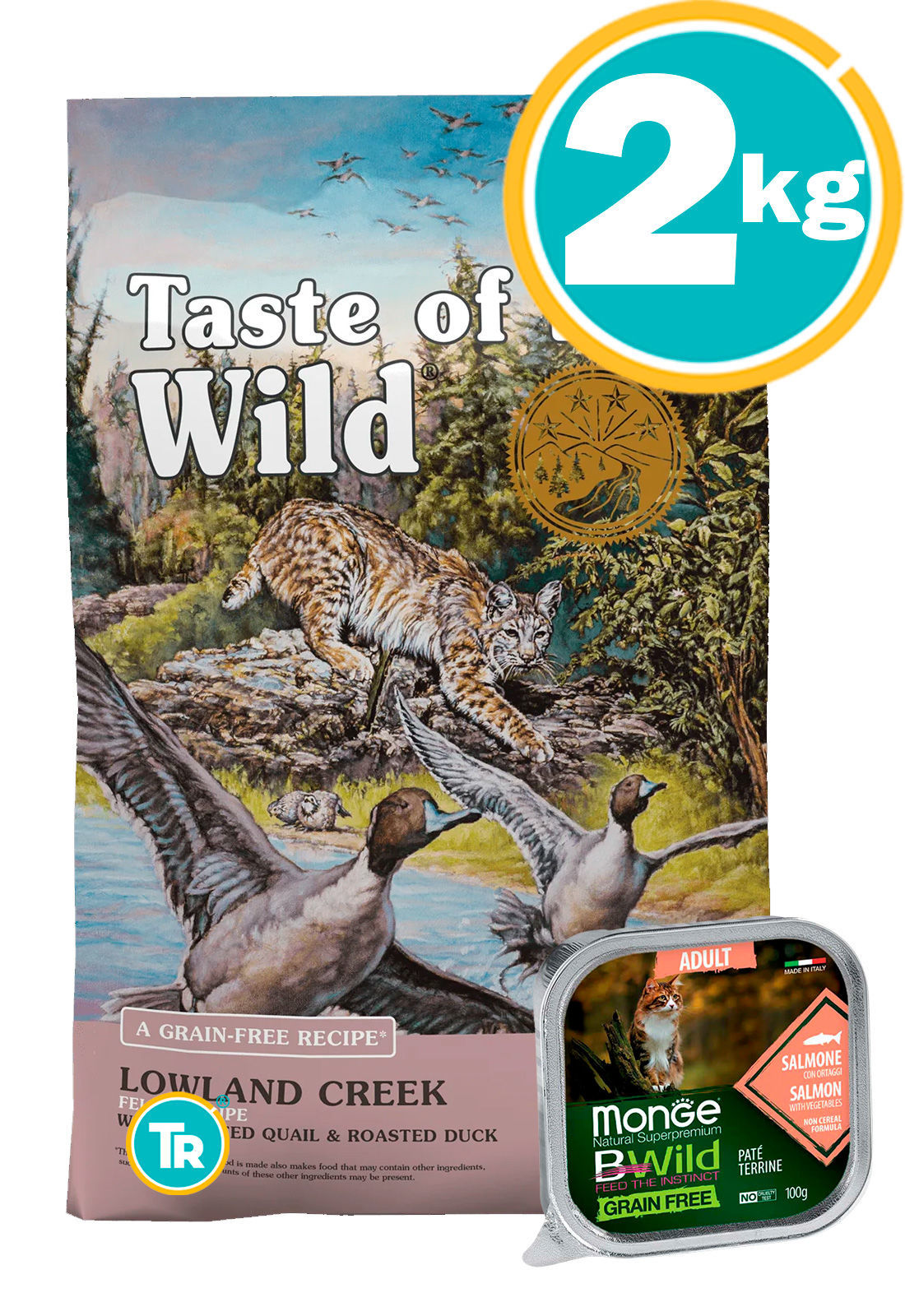 Taste of the Wild Lowland Creek es un pienso para gatos apto para todas las etapas. Elaborado con codorniz y pato que son proteínas altamente digestibles, contiene probióticos específicos de la especie para el apoyo digestivo e inmunológico, taurina para un corazón y ojos saludables, y antioxidantes de verduras, legumbres y frutas para el bienestar general.